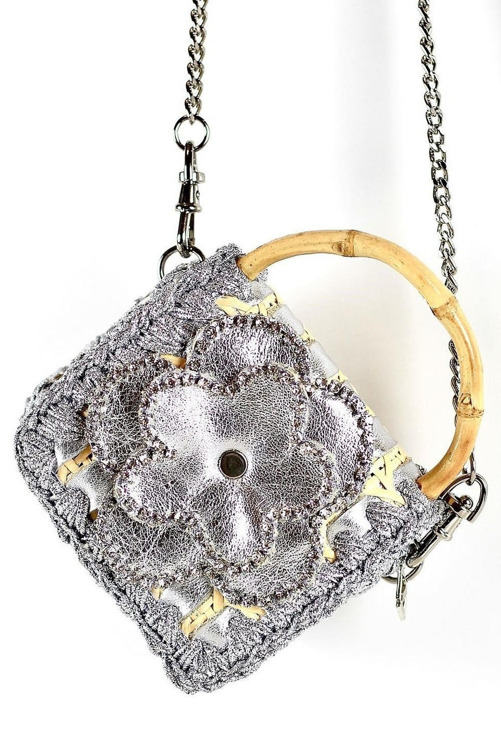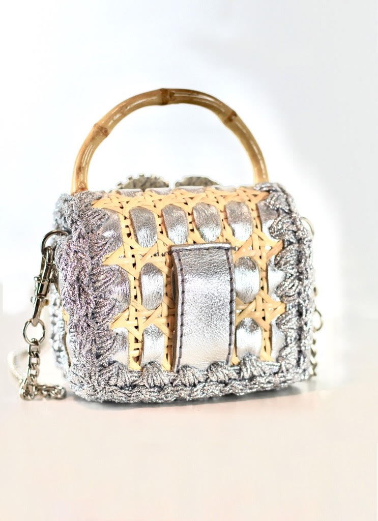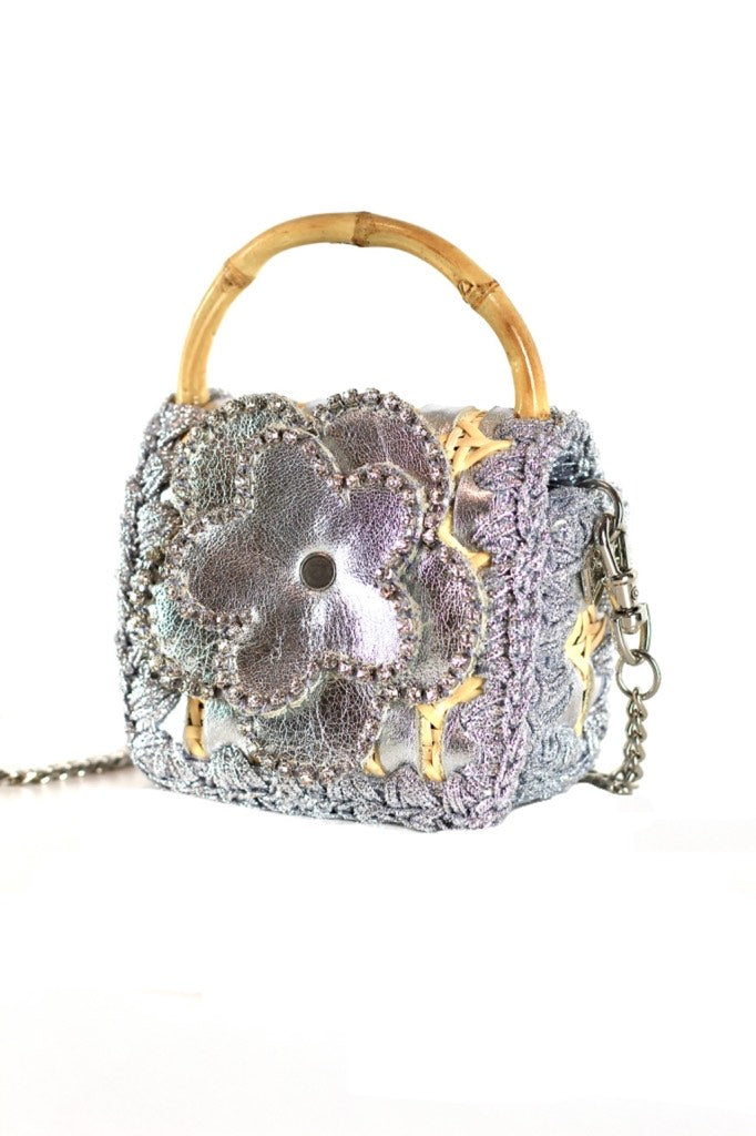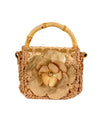 Expertly crafted from straw rattan and natural leather, this petite bag features a soft leather interior for an elegant touch. A graceful leather flower detail adds a jewel-like charm, making it truly stand out. The bamboo handle brings a natural sophistication, while the removable plated metal chain strap allows for multiple styling options.