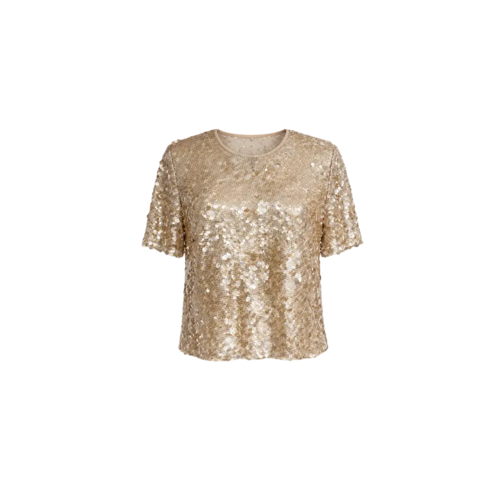 Crafted from lightweight mesh embellished with allover beige sequins, the Emma Cropped Tee adds subtle sparkle to a modern silhouette. Designed with a classic round neckline, short sleeves, and a cropped length, it offers a refined yet effortless look that’s easy to style. Perfect for pairing with tailored pants and a blazer, this versatile piece transitions seamlessly from day to night for parties, dinners, or special occasions.