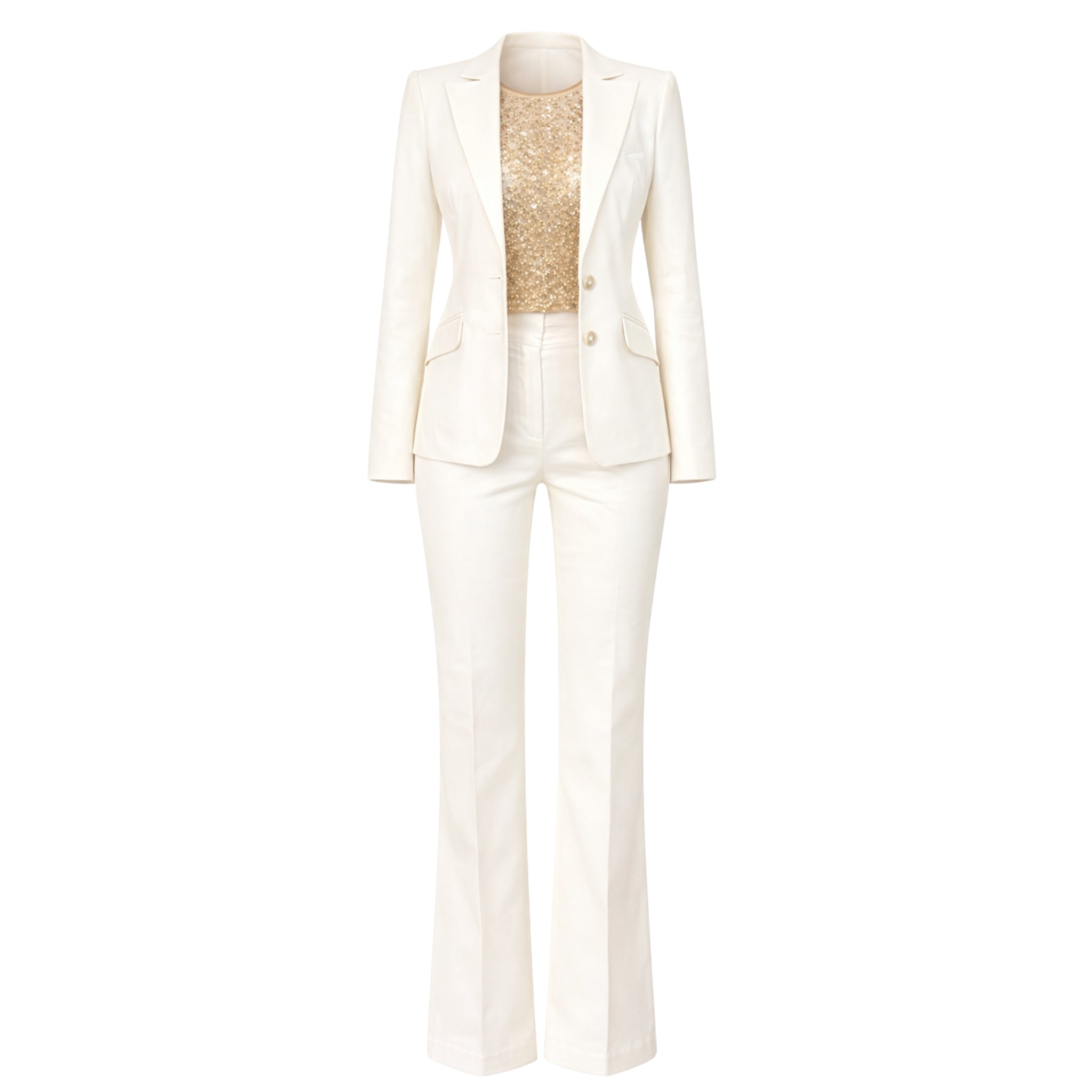 The Sadie White Denim Blazer and Pant offer a clean, tailored foundation with a modern edge. Crafted in crisp white denim, the blazer features a structured silhouette with classic lapels and gold-tone buttons, while the matching wide-leg pant elongates the frame with a flattering, effortless fit. Paired with the Emma Sequin Tee, the look is elevated with subtle shimmer, blending sharp tailoring with a touch of glamour. Perfect for day-to-night dressing, this ensemble transitions seamlessly from polished daytime events to evening dinners or celebrations with ease.