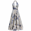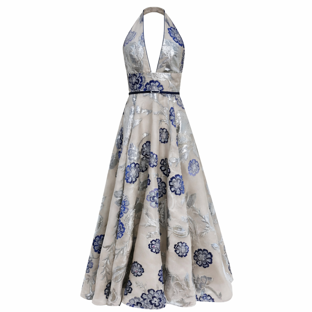 This elegant halter-neck maxi dress features a deep V-neckline and a flattering fitted waist, highlighted by a thin silk belt with a crystal buckle, and flows into a full A-line skirt for a graceful silhouette. Crafted from luxurious floral brocade fabric in soft ivory with silver and navy blue accents, it has a delicate metallic sheen that catches the light beautifully, making it an ideal choice for formal events, weddings, or any special occasion where timeless sophistication is desired.