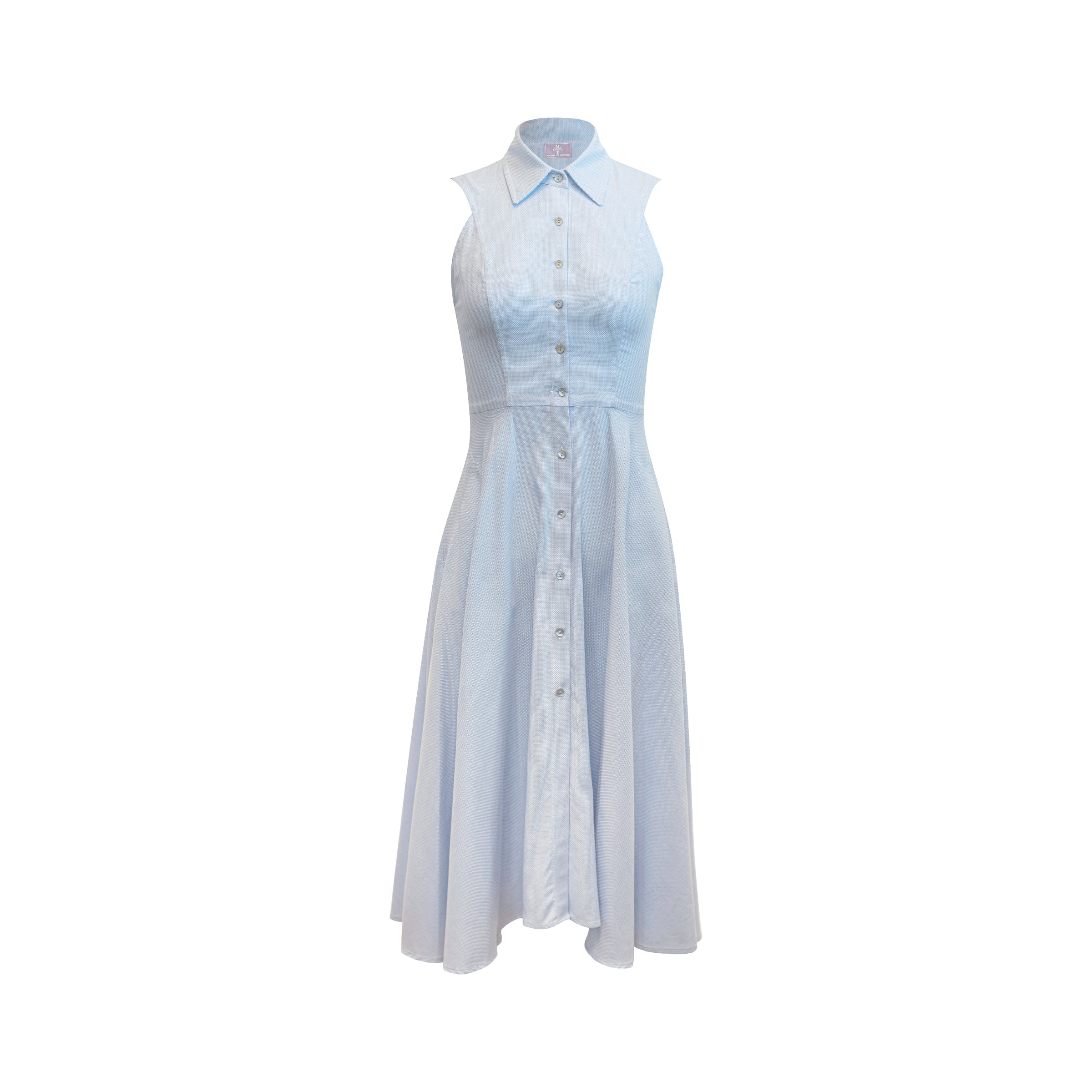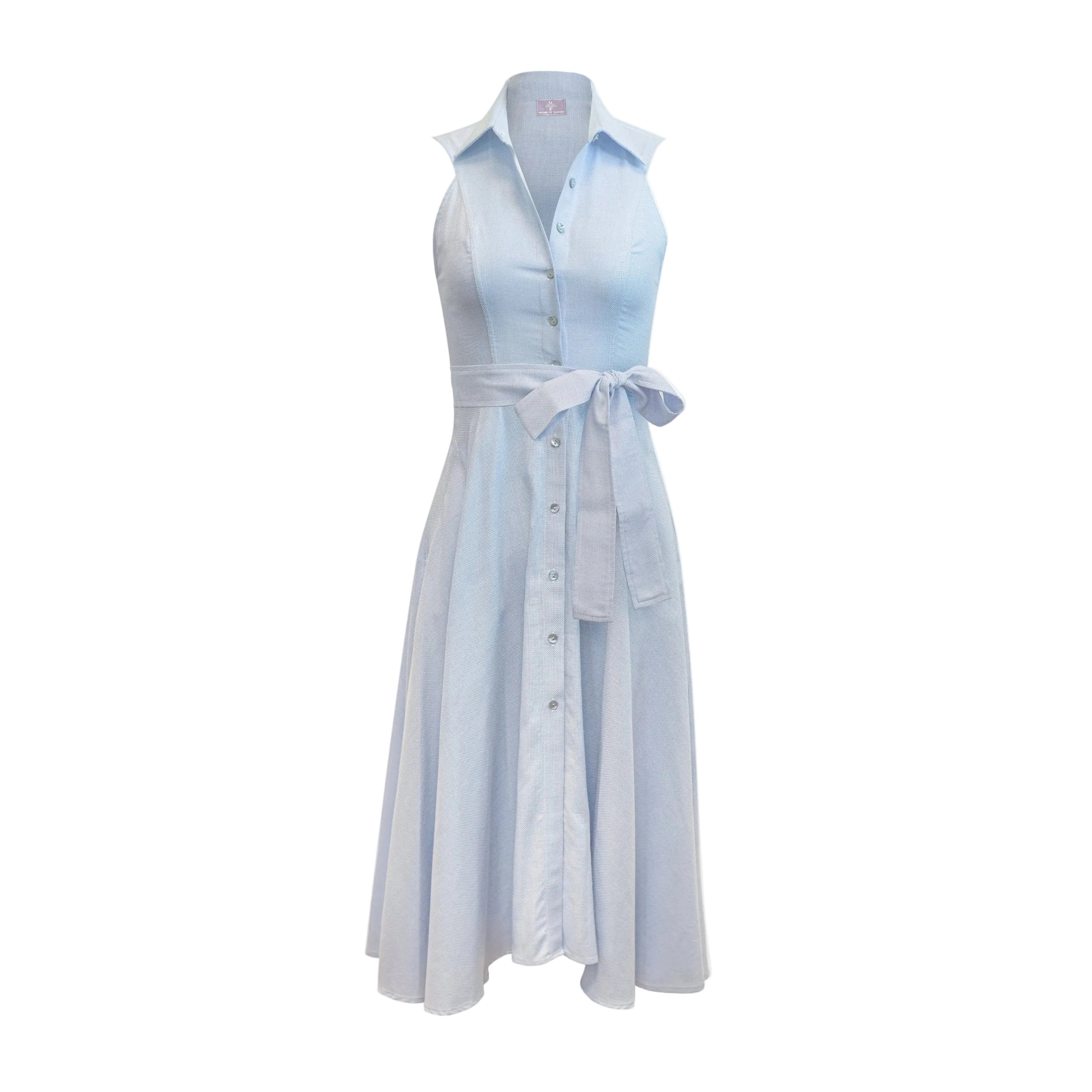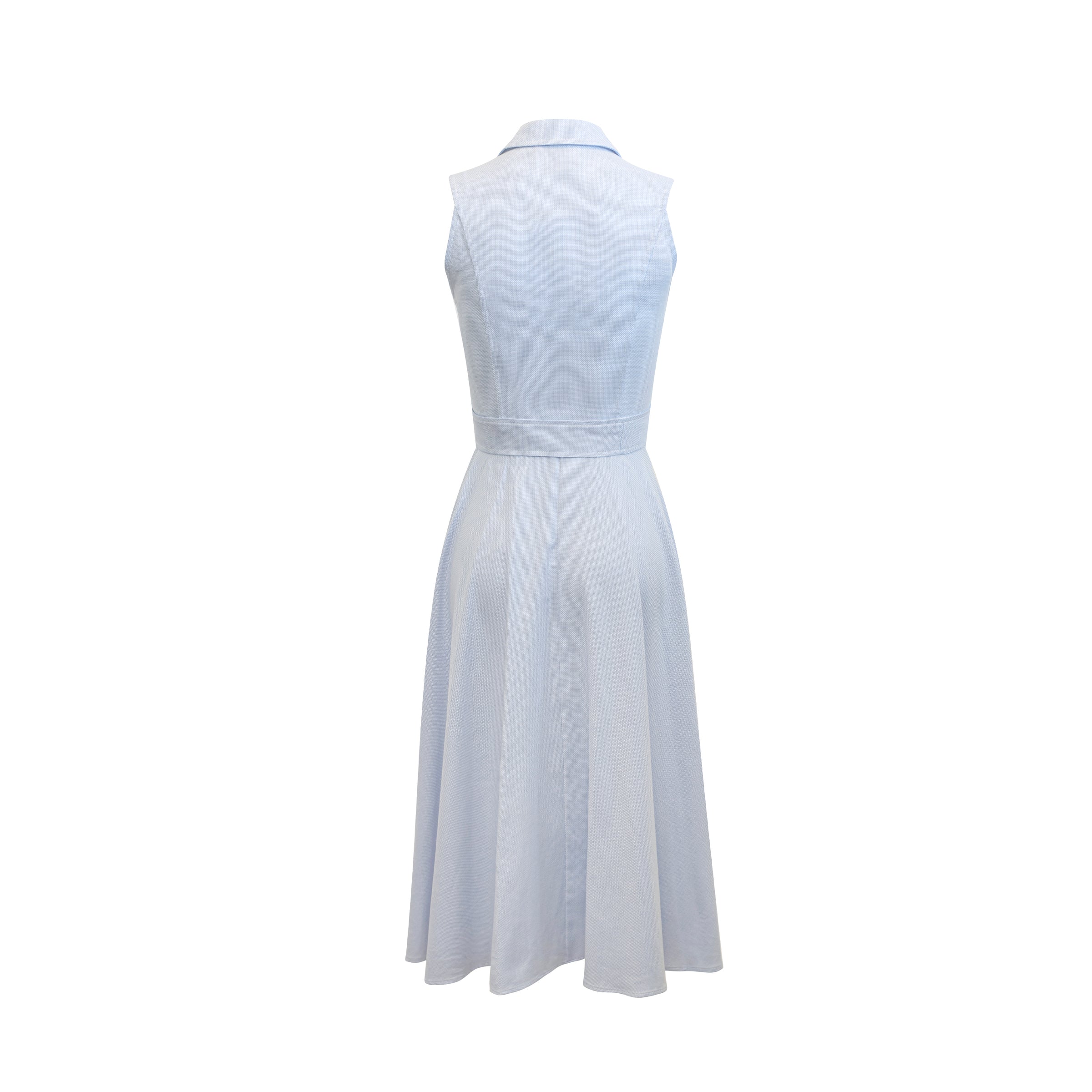 The Alice Midi Dress with white embroidery features a sleeveless design, a classic collar, a flattering button-down front, and convenient pockets. It's the perfect dress for casual outings and special occasions during spring and summer with its mid-length.