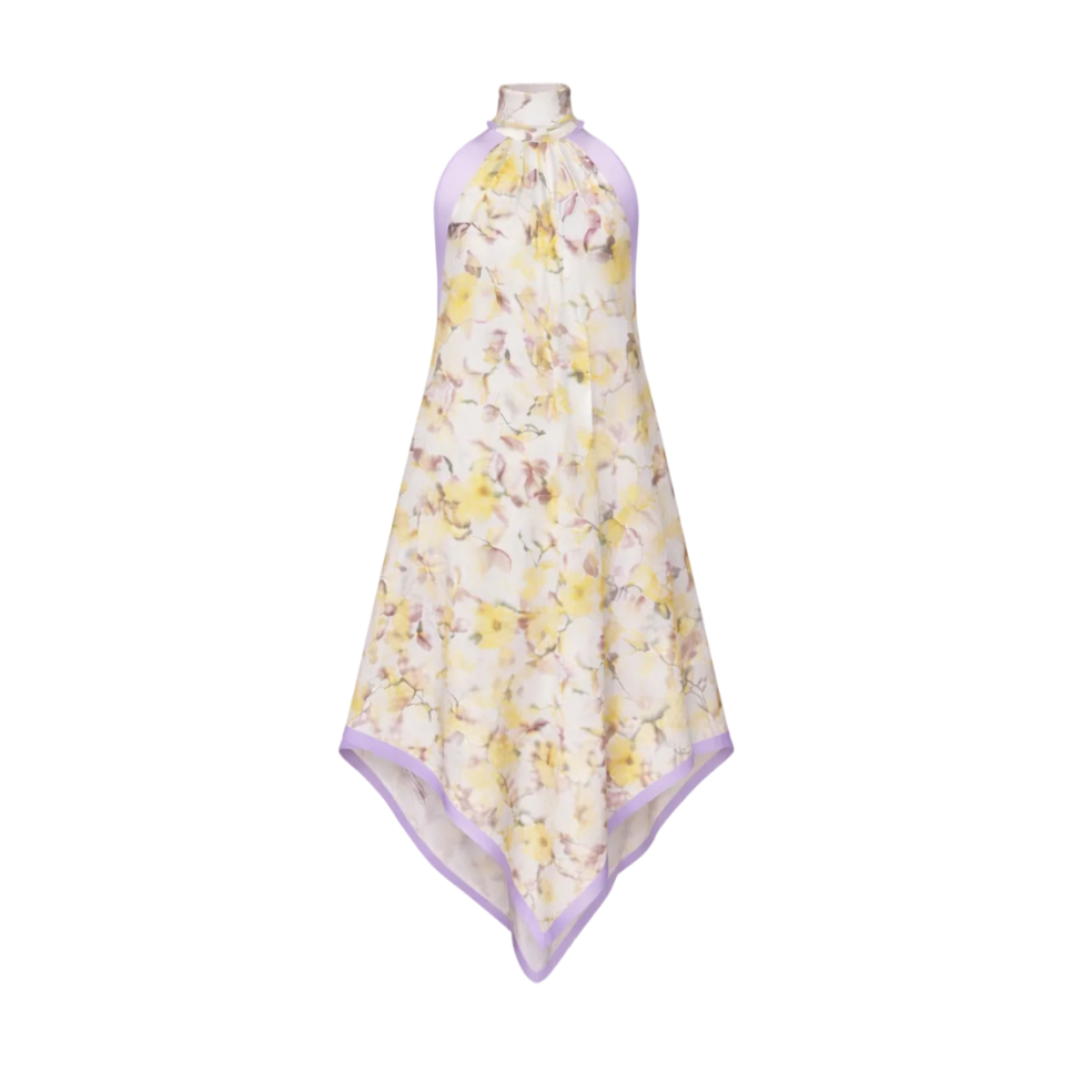 The Gwendolyn Dress in Yellow Flowers is a statement silhouette crafted from luxurious silk charmeuse in a limited-edition floral print. Designed with a graceful halter neckline and fluid midi-length shape, it drapes beautifully with soft, effortless movement. Lavender silk charmeuse trim frames the neckline and high side slits, adding a refined contrast and elevated finish. Feminine and artfully detailed, the Gwendolyn Dress is the perfect resort wear piece, transitioning seamlessly from sunlit days to elegant evening moments.