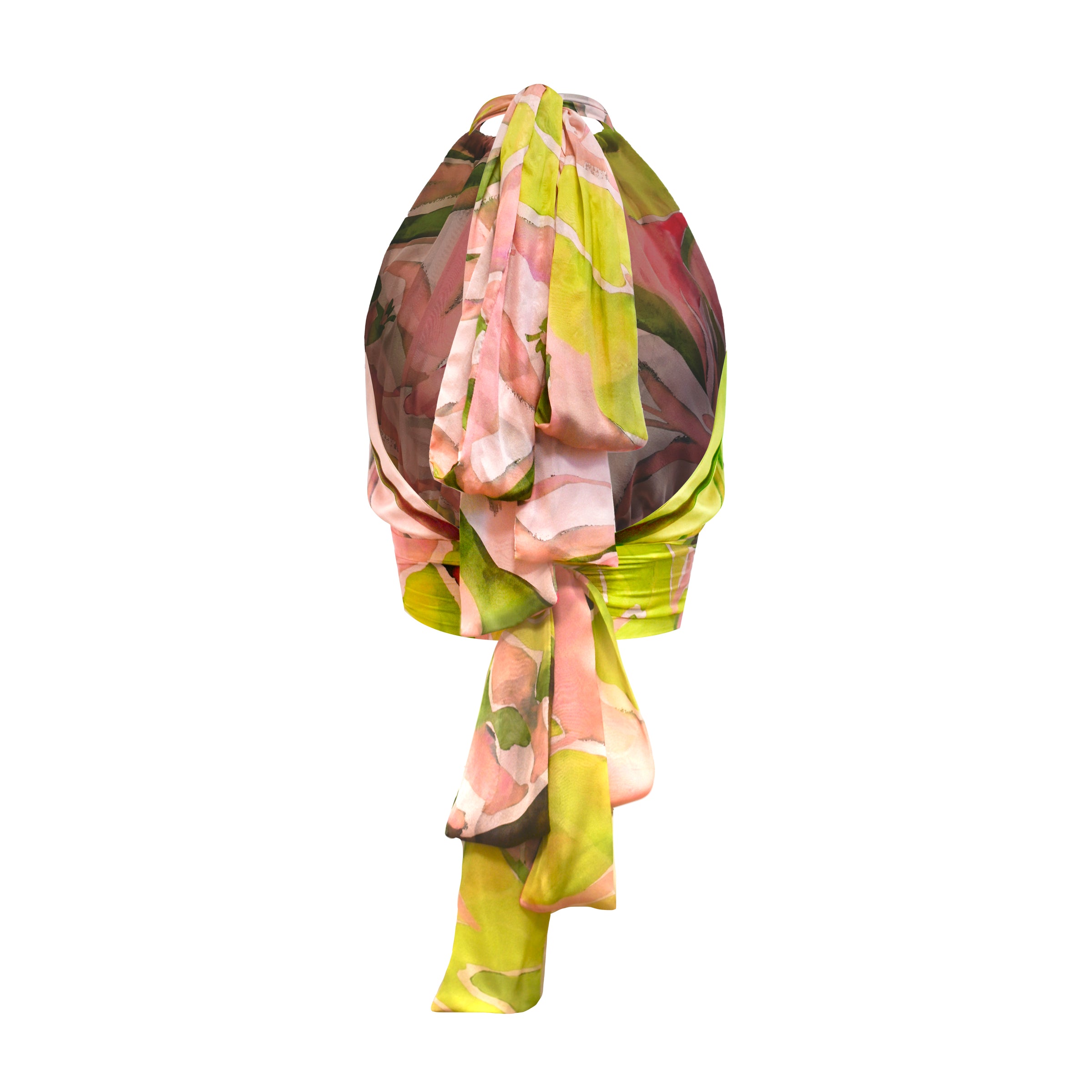 Explore versatility with the Bardot Top in Silk Chiffon and Pink and Green limited edition print. Featuring a halter top design with an attached wrapped belt, offering a customized fit and catering to different body types and style preferences. Express your distinctive style through various tie options, whether it's chic bows or artful knots on the back or front.