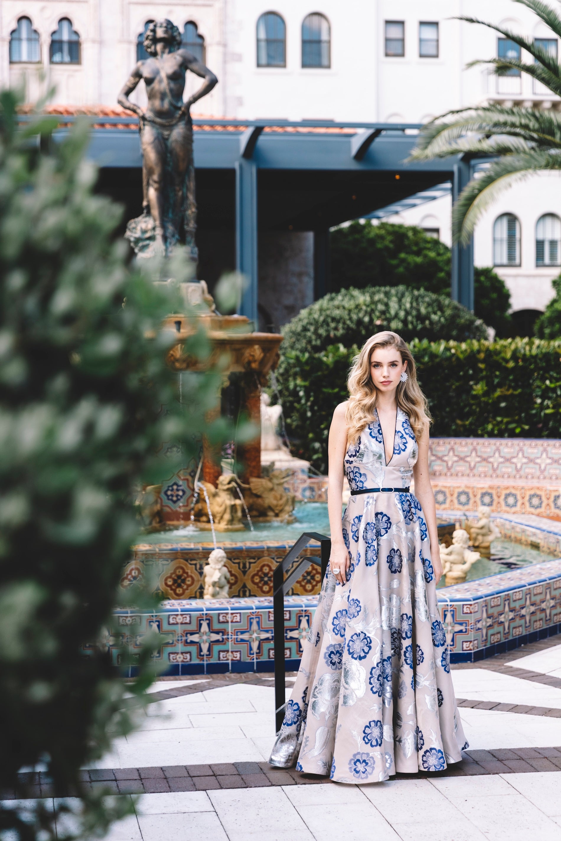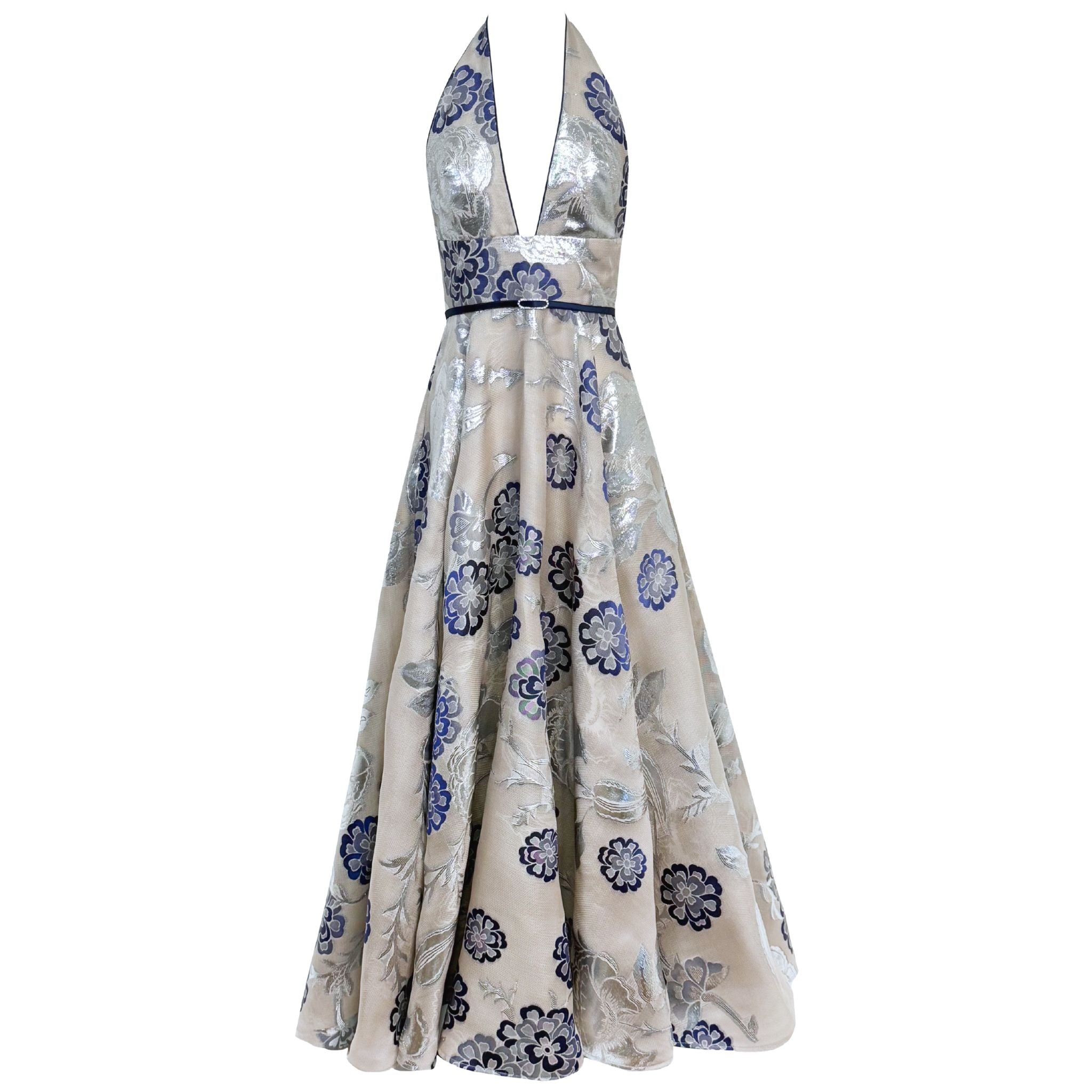 This elegant halter-neck maxi dress features a deep V-neckline and a flattering fitted waist, highlighted by a thin silk belt with a crystal buckle, and flows into a full A-line skirt for a graceful silhouette. Crafted from luxurious floral brocade fabric in soft ivory with silver and navy blue accents, it has a delicate metallic sheen that catches the light beautifully, making it an ideal choice for formal events, weddings, or any special occasion where timeless sophistication is desired.