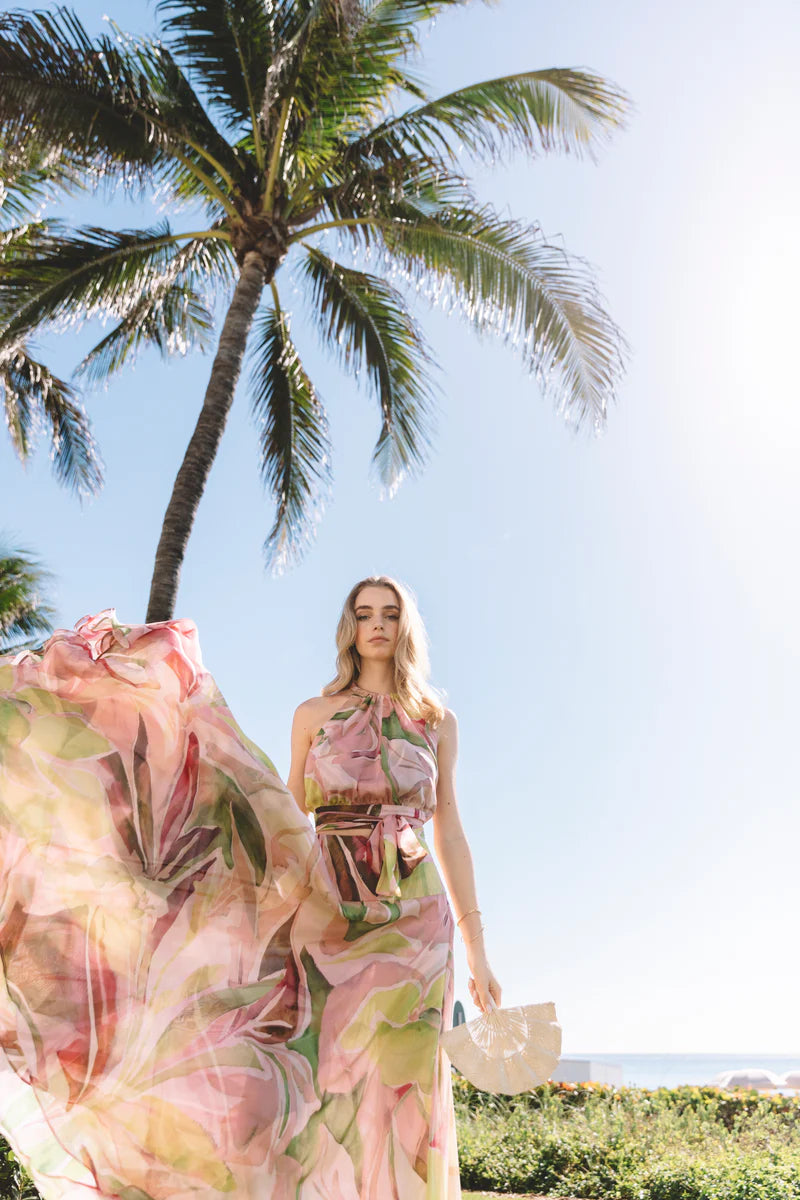 Explore versatility with the Bardot Top, crafted from silk chiffon and featuring the limited edition Pink Yellow Flowers print, made in Palm Beach, USA. Designed with a halter neckline and an attached wrap belt, it offers a customizable fit that flatters a range of body types and styling preferences. Designed for versatility, it can be tied in multiple ways, from chic bows to artful knots at the front or back, allowing you to express your distinctive style with ease.