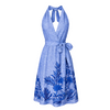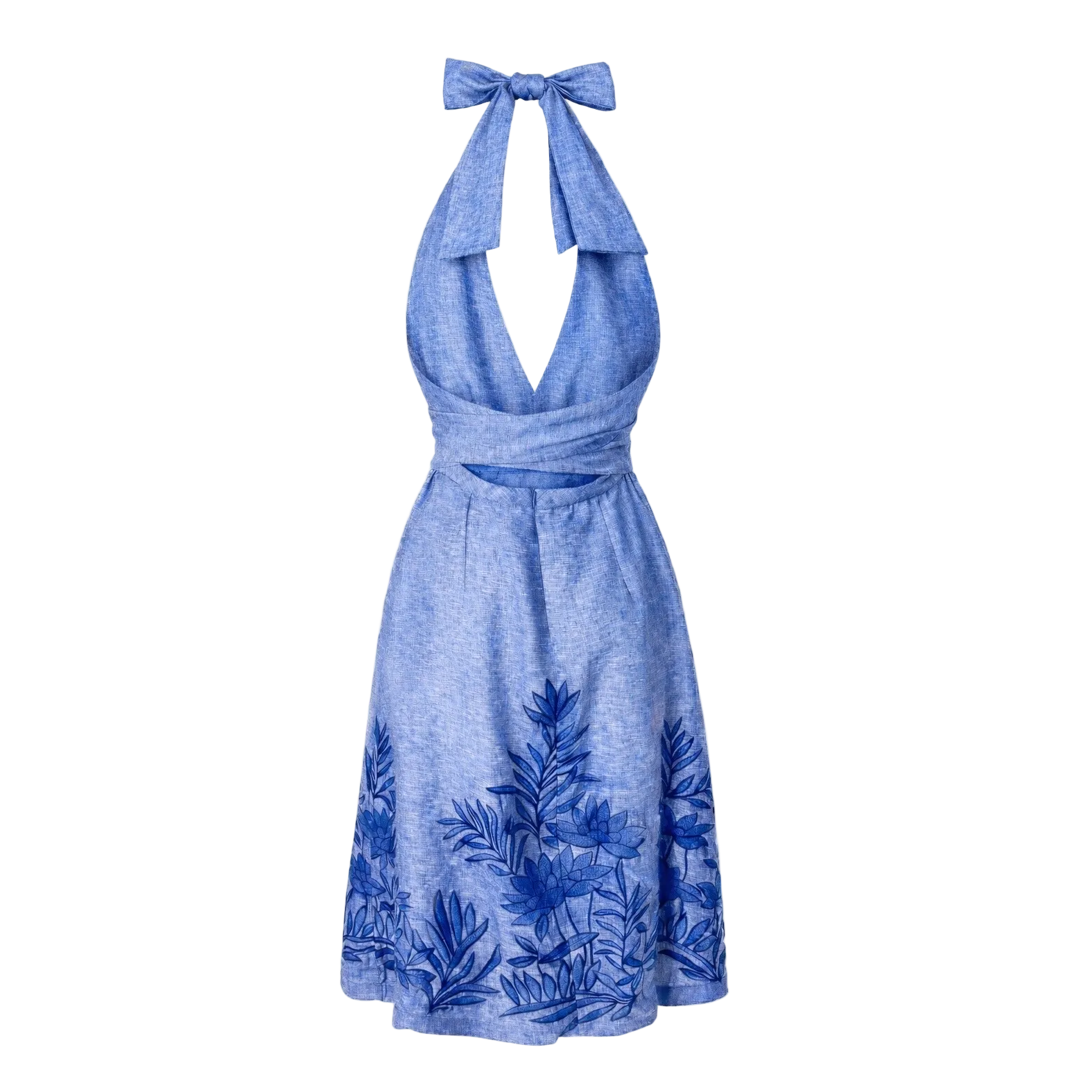 A feminine halter dress designed with a flattering A-line silhouette and elegant embroidered detailing. Crafted from lightweight linen, this effortless style features a deep V neckline, an adjustable wrap waist tie, and intricate navy botanical embroidery along the skirt for a refined artisanal touch. Made in Palm Beach, USA, this piece reflects refined craftsmanship and timeless coastal style.