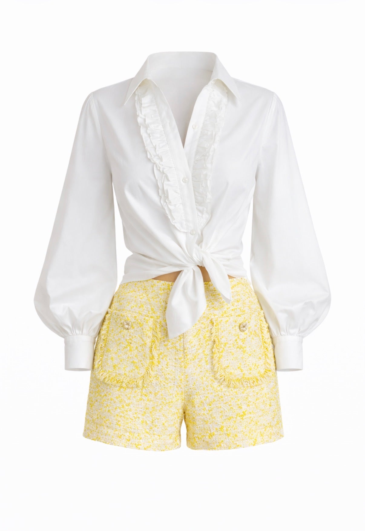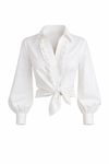 Crafted from crisp cotton poplin in optic white, the Zoey Blouse delivers a polished, feminine look with modern ease. Designed with a classic pointed collar and a ruffled button placket, it features long voluminous sleeves with fitted cuffs and a flattering front-tie hem that defines the waist. Effortlessly versatile, it pairs perfectly with tailored trousers, denim, or a sleek skirt for day-to-night styling.