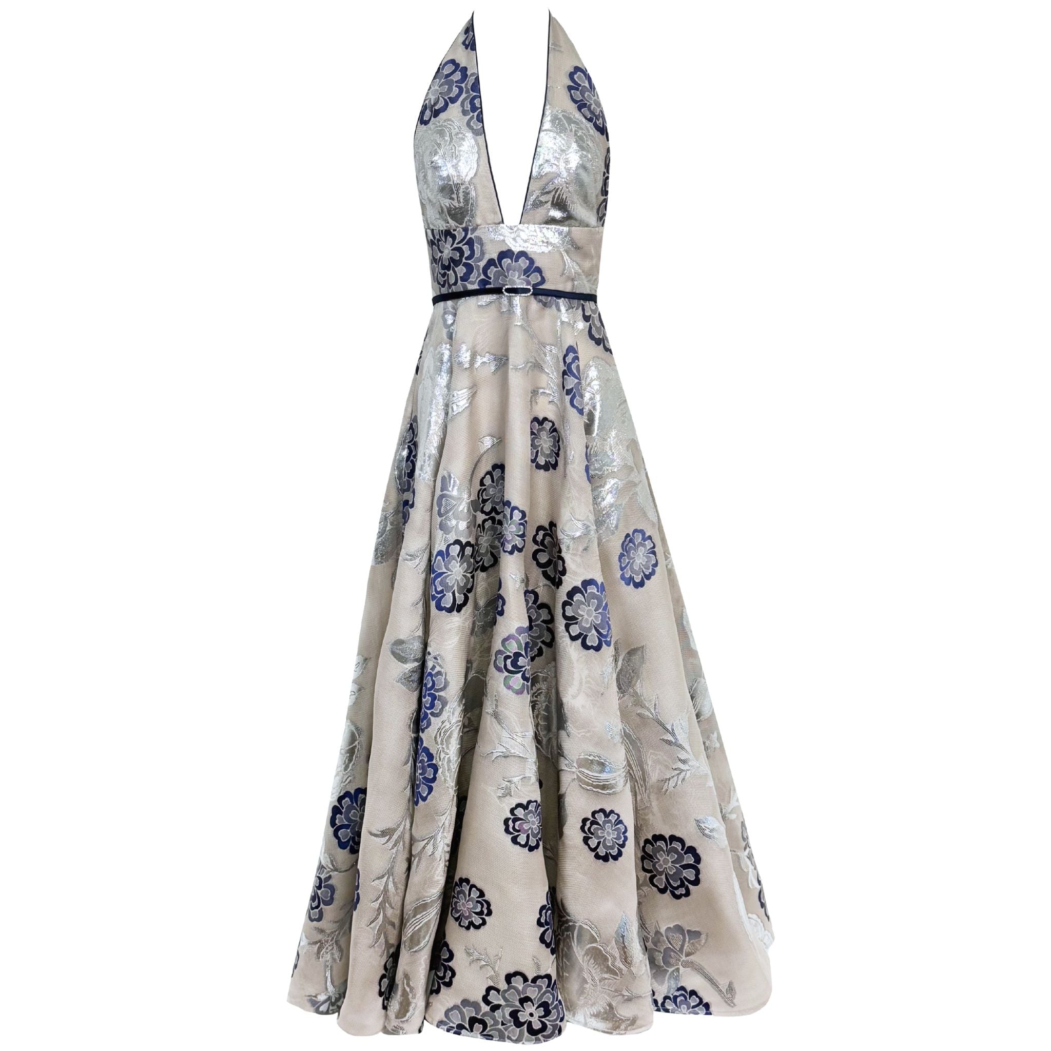 This elegant halter-neck maxi dress features a deep V-neckline and a flattering fitted waist, highlighted by a thin silk belt with a crystal buckle, and flows into a full A-line skirt for a graceful silhouette. Crafted from luxurious floral brocade fabric in soft ivory with silver and navy blue accents, it has a delicate metallic sheen that catches the light beautifully, making it an ideal choice for formal events, weddings, or any special occasion where timeless sophistication is desired.