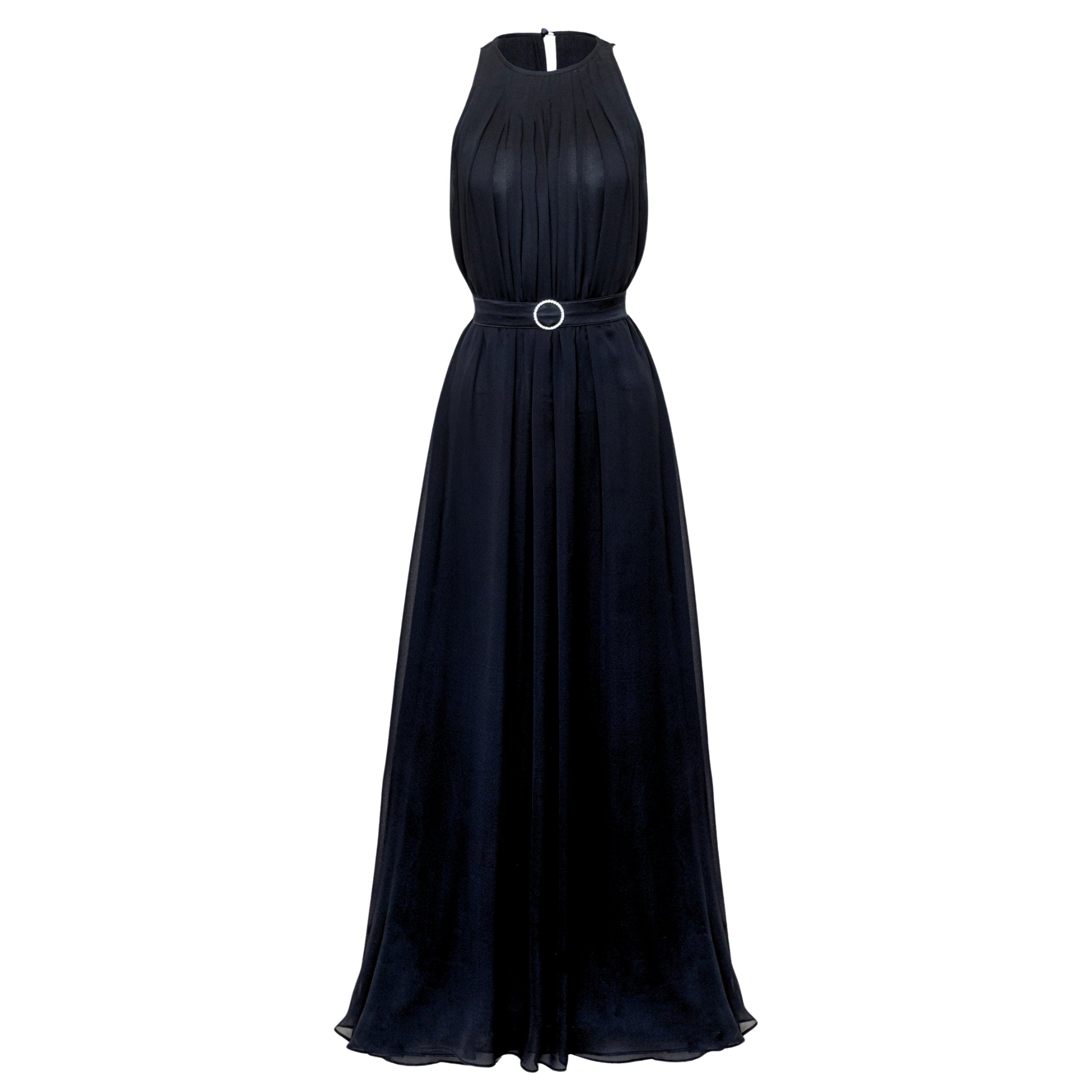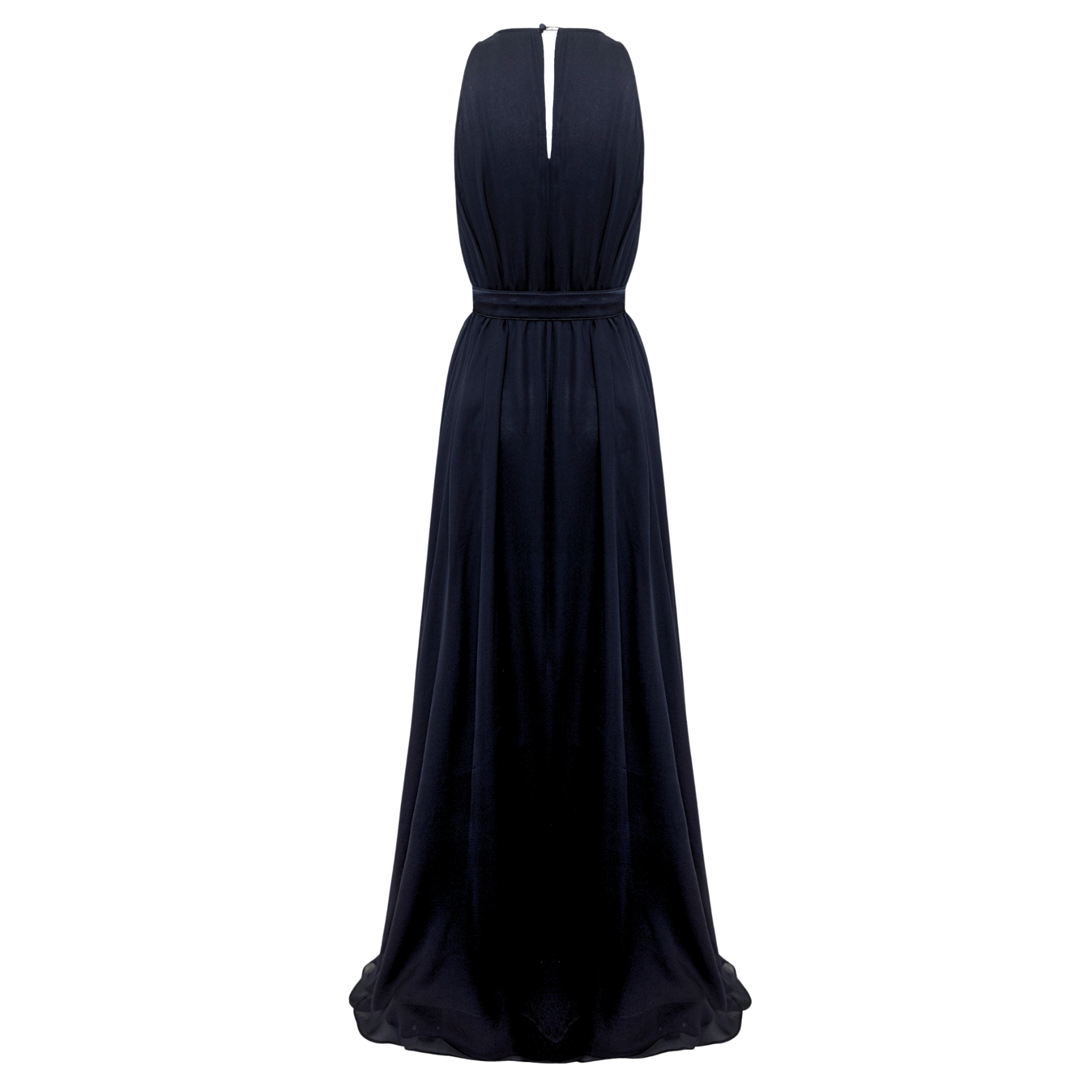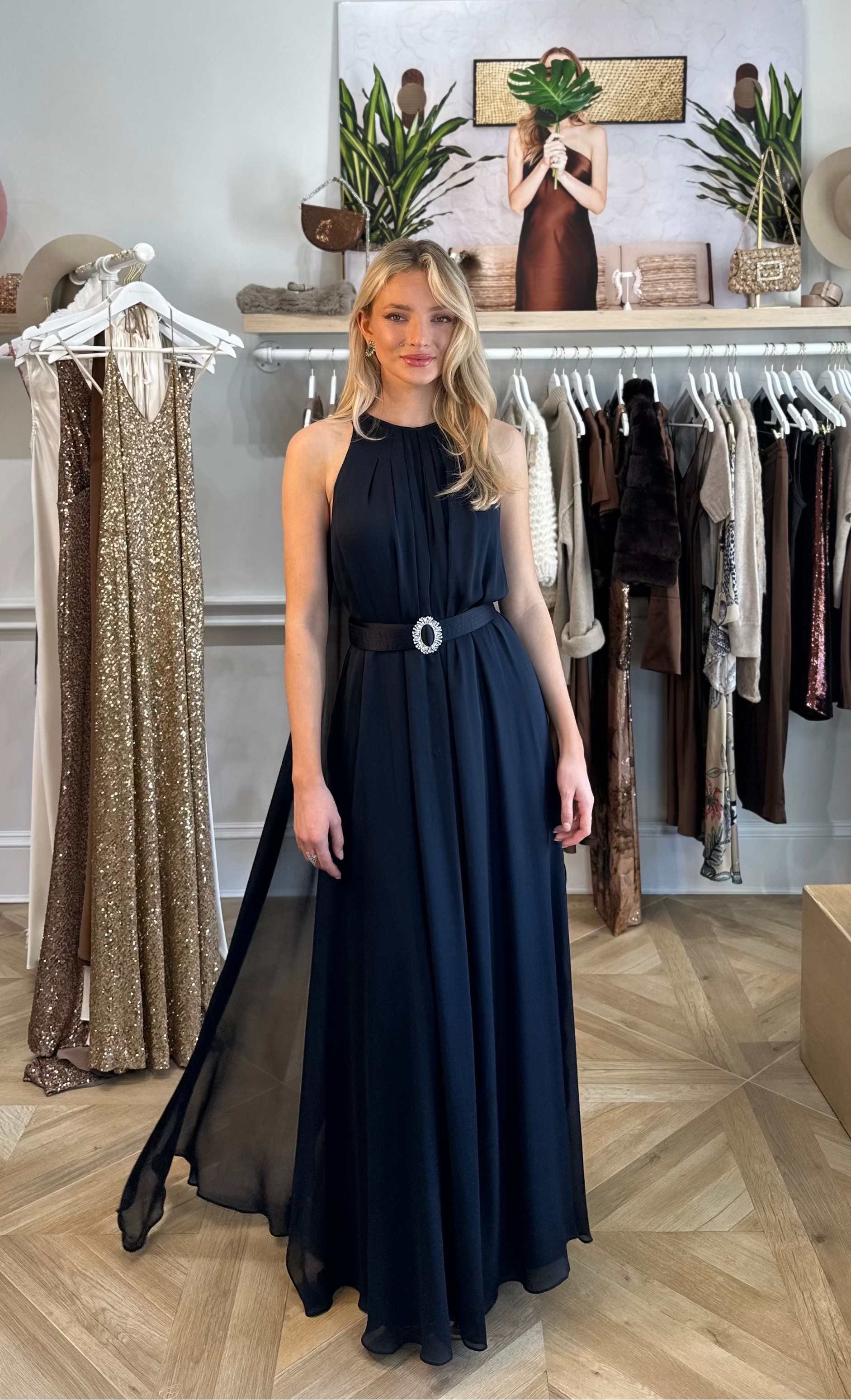 Sabi Gown in double layered Silk Chiffon with chiffon built in cape, top layer open on side and floats as you walk. Removable belt in Silk Charmeuse.