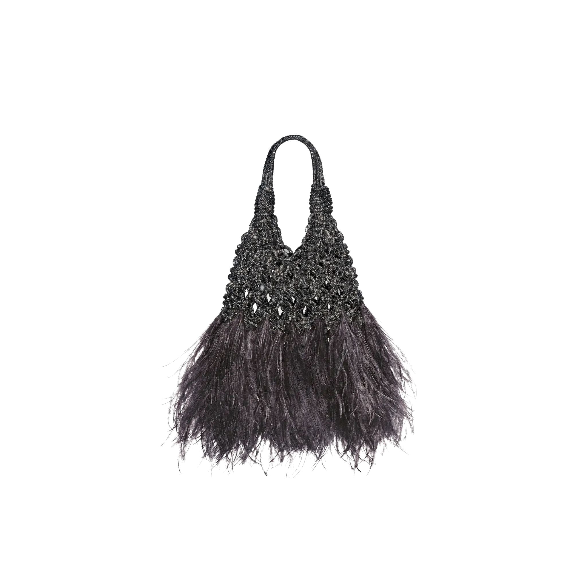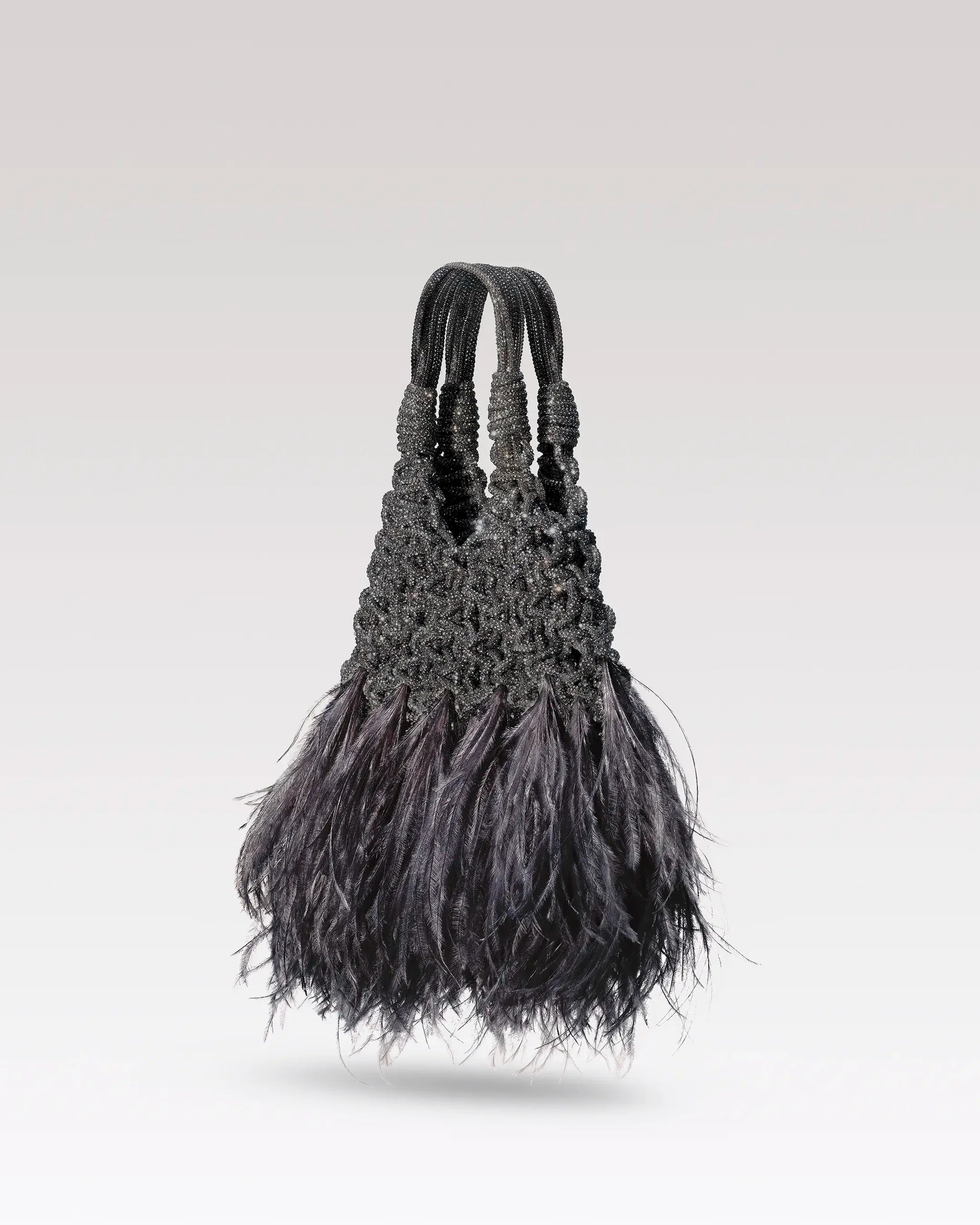 The Vannifique bag, handmade in Italy, effortlessly transitions from day to evening. Crafted with a refined weaving technique, it features yarn adorned with precious crystals and sophisticated tone-on-tone ostrich feathers, making it a chic and versatile statement piece. Dimensions: H42 x W20 x D10 cm.