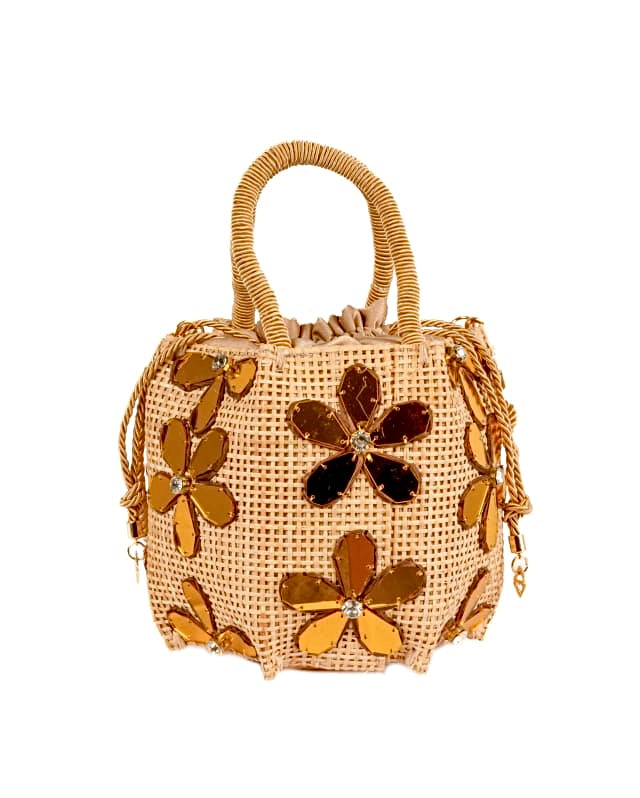 A radiant celebration of craftsmanship and charm, the Kiki Reflexe Fleuri Bag is a true statement piece. Handwoven from natural fibers, this bag features a unique structure that beautifully showcases reflective floral appliqués, each adorned with sparkling crystal centers — like sunlight captured in bloom.